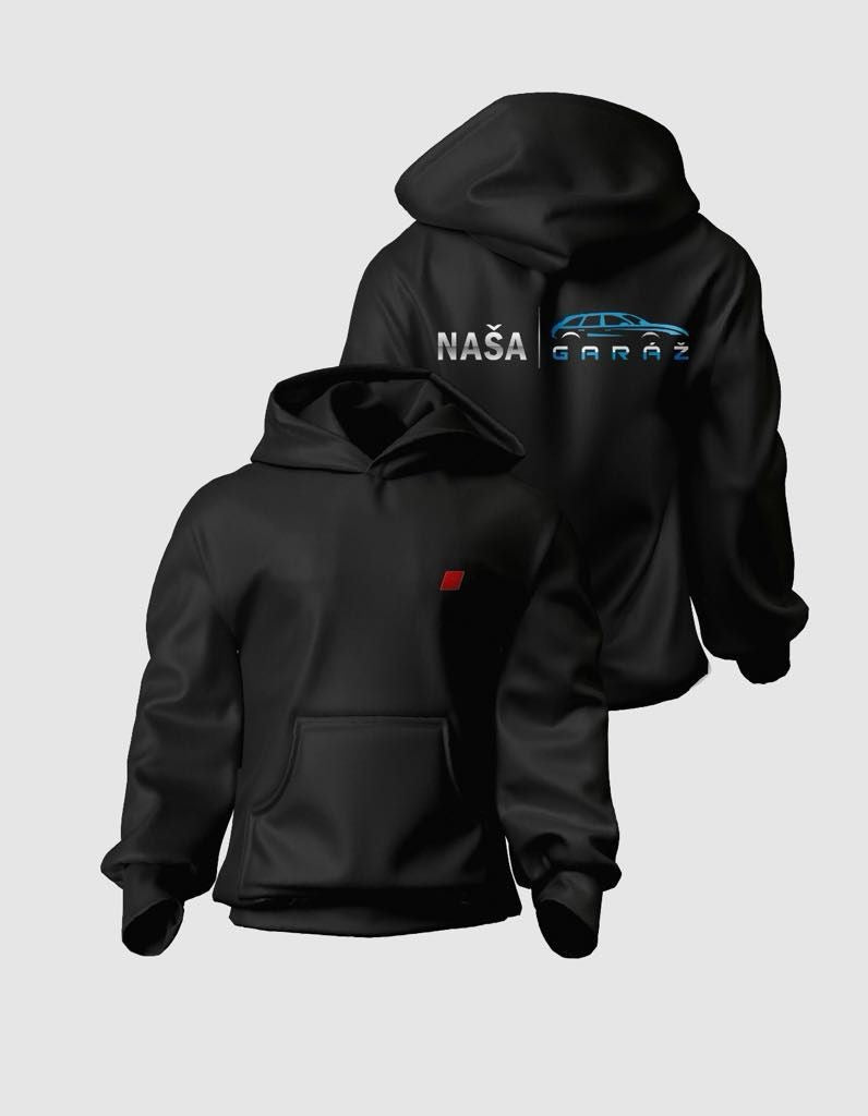 Mikina naša garáž s červeným obdĺžnikom vpredu a originálnym logom vzadu